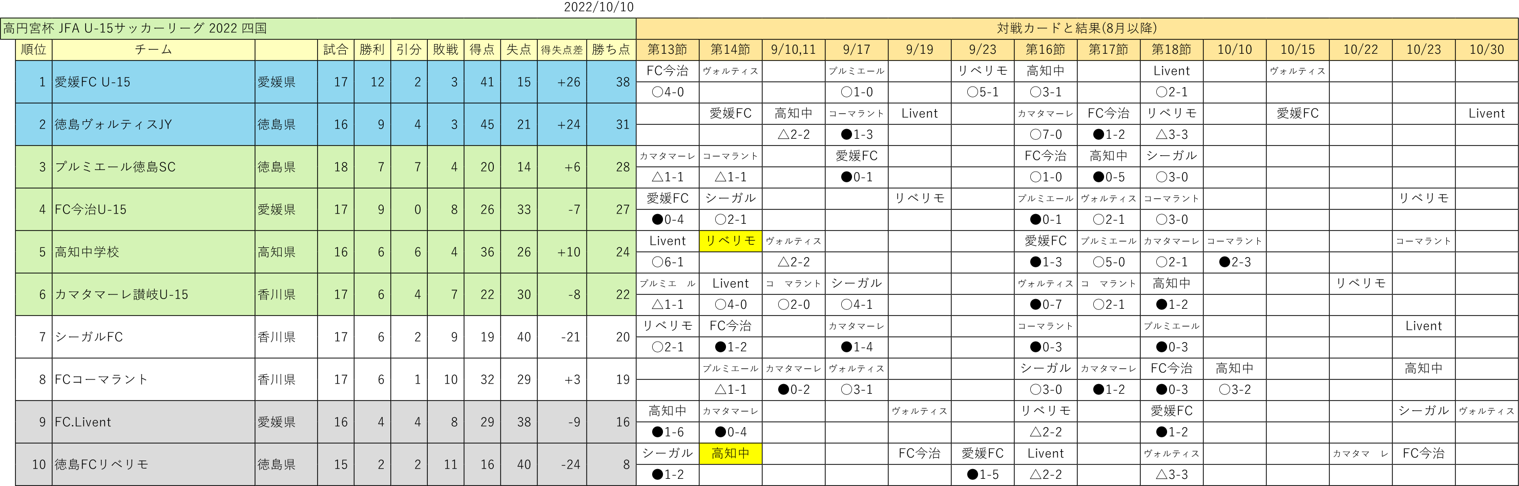 まずは、10/10 の試合の結果で、高知中学校が敗れたため、徳島ヴォルティスJYの2位以上が確定し、徳島ヴォルティスJYの高円宮杯本大会出場が決まった。