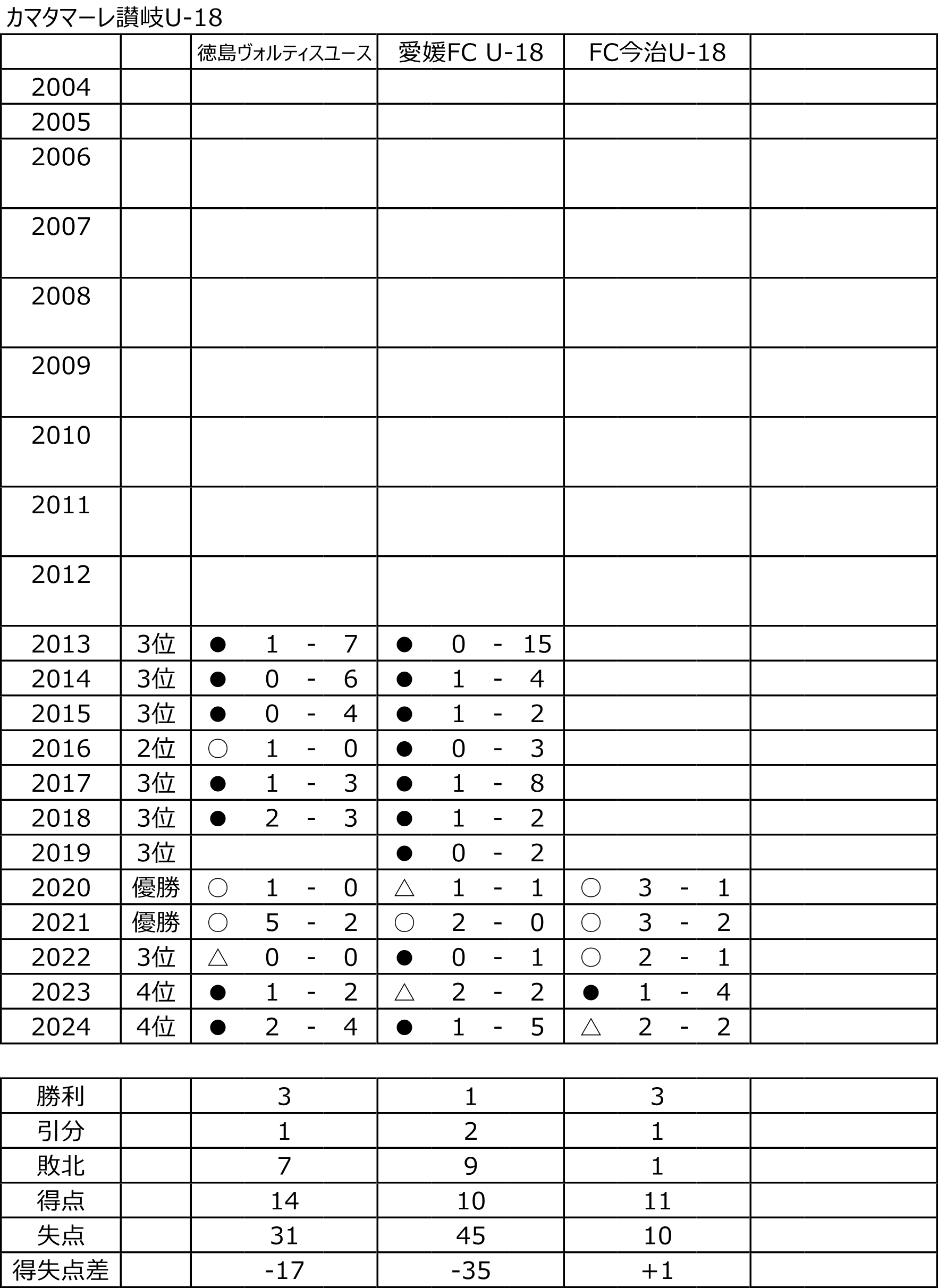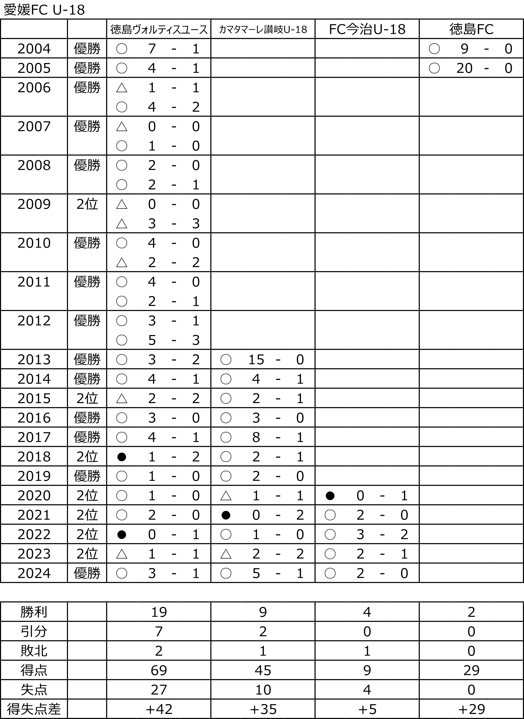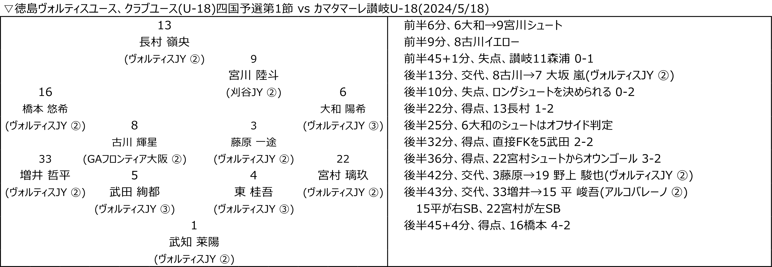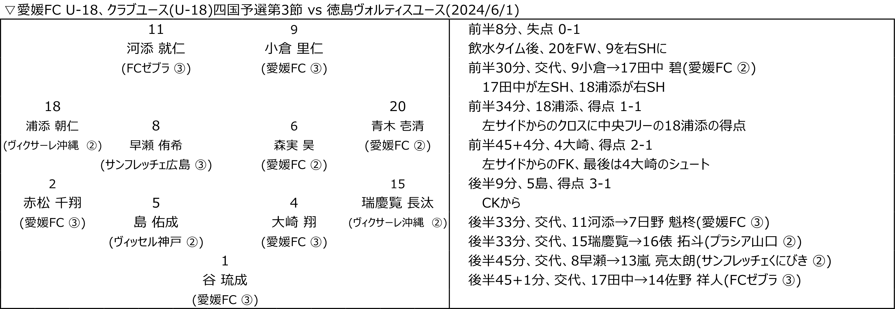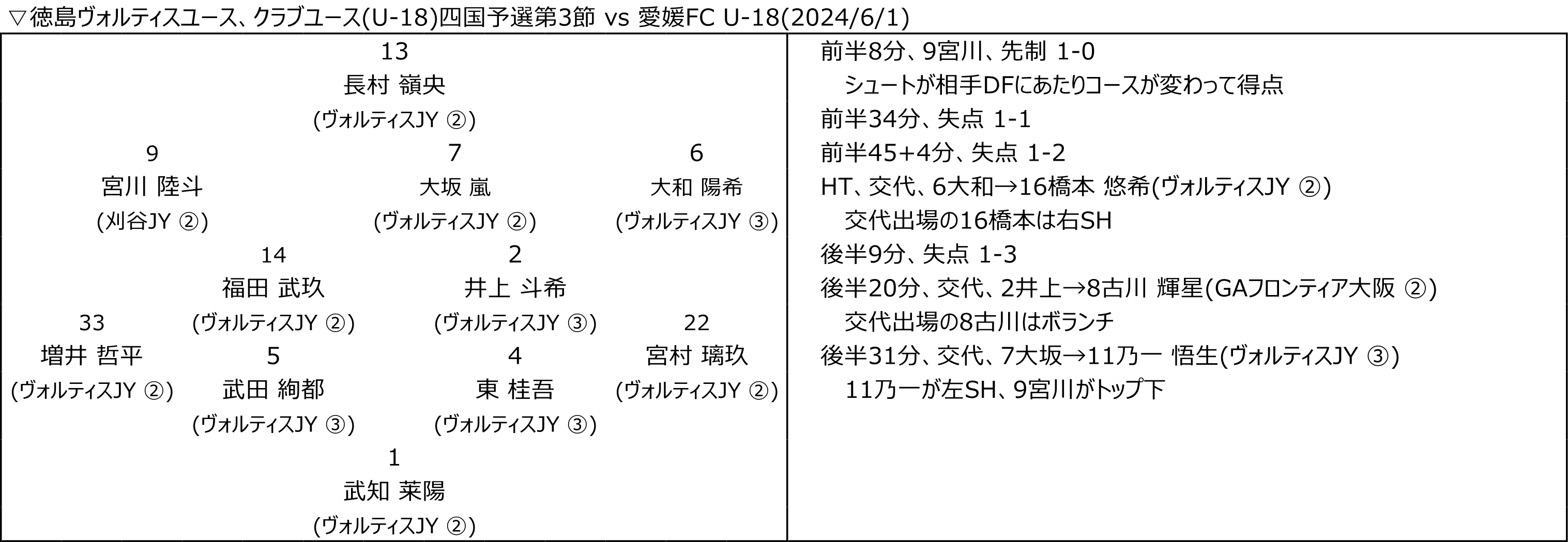 クラブユース四国予選、2位 2024.06.02 徳島ヴォルティスユース、クラブユース四国予選は2位でした。最後、愛媛FC U-18との試合、リードした時間帯もあったのですが、、、うまくやられました。が、選手は個々の力は出せたかと思うし、まだまだできる部分もあったので、残りのプリンスリーグ四国は全勝で乗り切るぐらいでやって欲しいかと。。 愛媛FC U-18は四国代表として、まずは頑張って欲しいかと。 (試合内容などについてはあとで加筆したいかと…)
