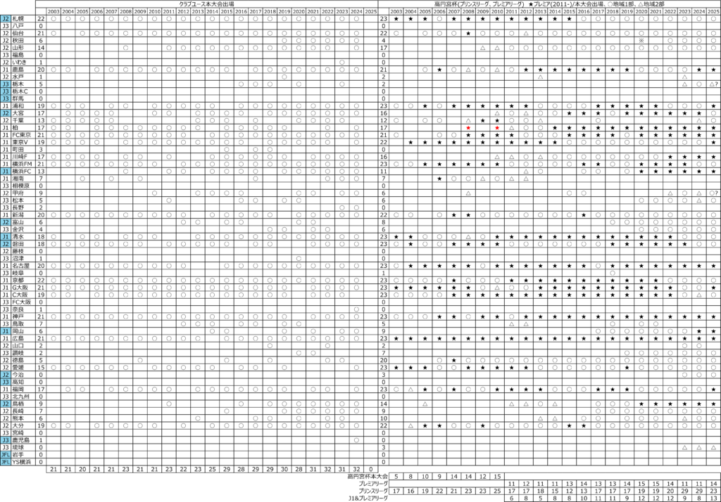 過去、J1&プレミアリーグ、というのは12クラブというのが最多。J1のクラブ数が増えた、というのもあるが、13は過去最多を更新。