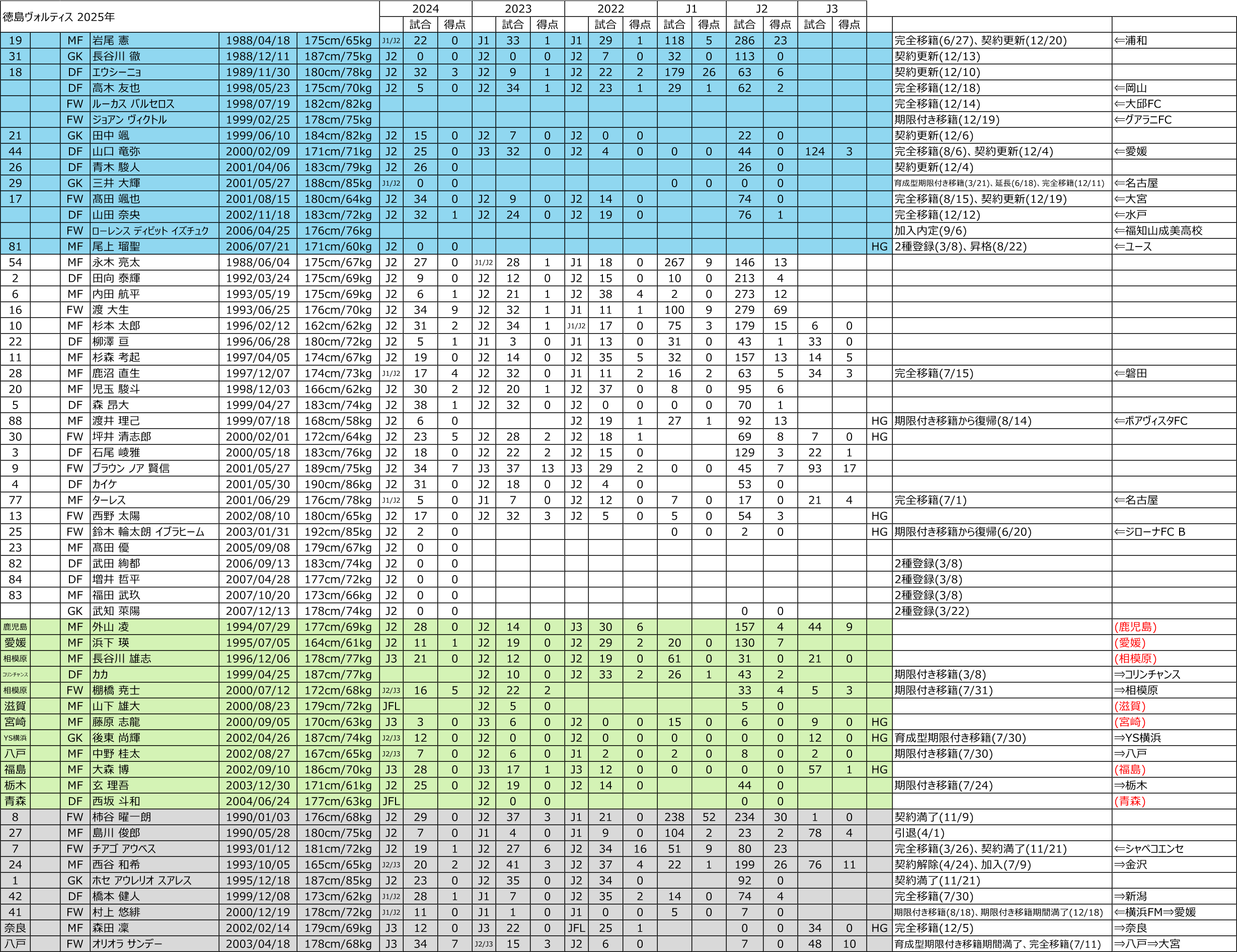 徳島ヴォルティス、契約更新状況(2024/12/20)