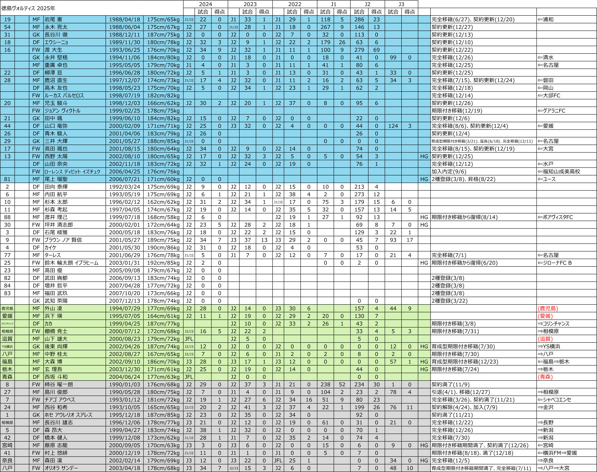 徳島ヴォルティス、契約更新状況(2024/12/27)