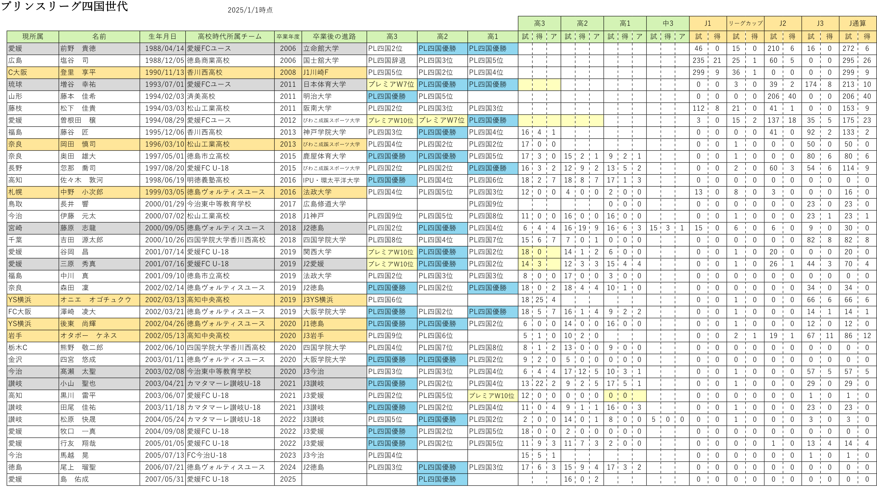 プリンスリーグ四国世代の選手(2025/1/1時点) 2025.01.02 プリンスリーグ四国世代のJクラブの選手一覧未契約の選手は薄いオレンジ色にしています。契約満了となった選手は薄いグレー。できるだけ多くの選手がJリーグでプレーして欲しいかと思っています。一応頑張って調べてはいるのですが、漏れている選手などがいましたら教えていただければ…。