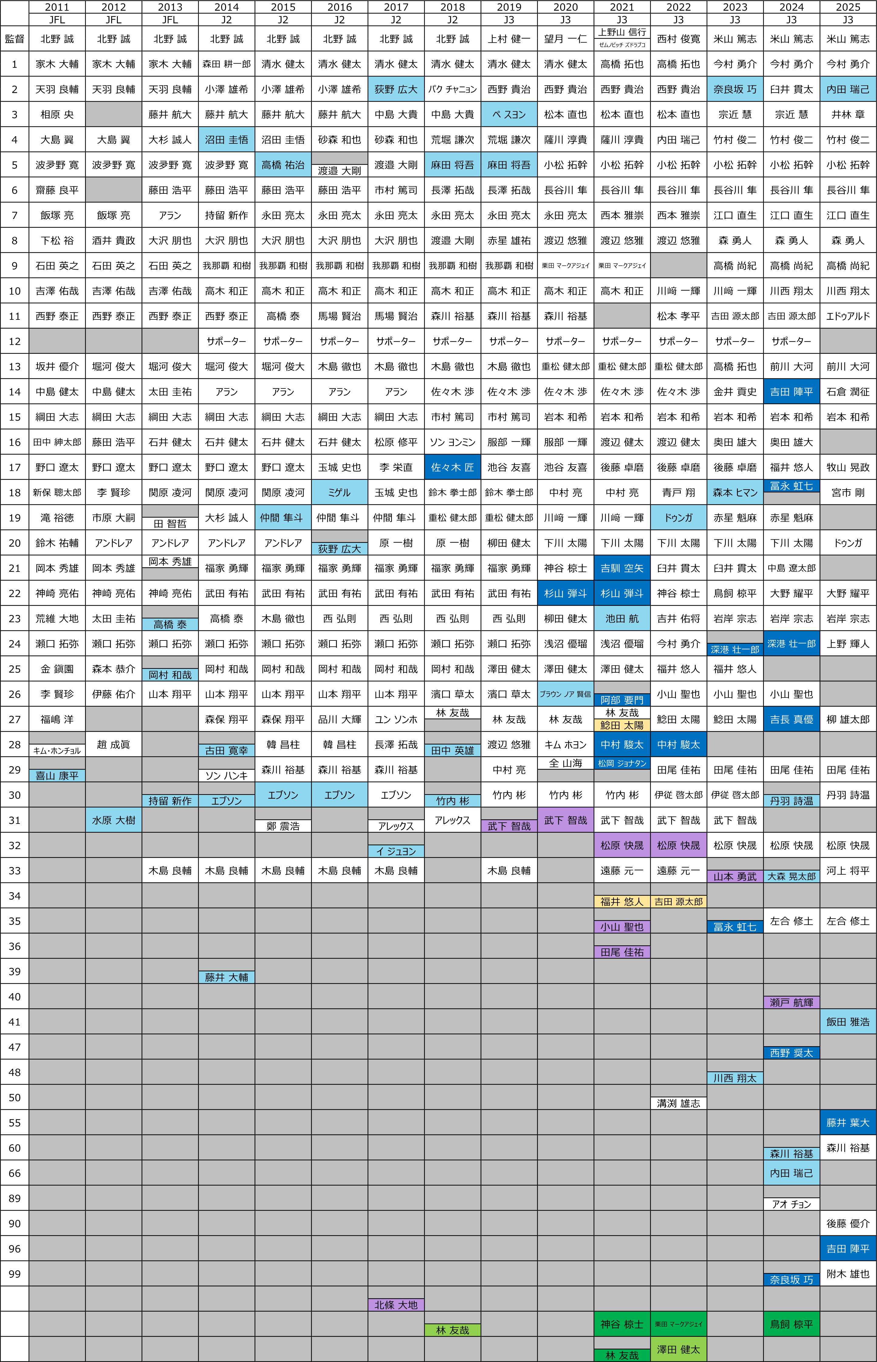 カマタマーレ讃岐2025(2025/01/04時点) 2025.01.04 1/4、内田 瑞己選手の期限付き移籍期間の延長が発表。背番号も2に決まった。これで32名。これまでの背番号一覧と、Jリーグでの背番号別成績。試合順での一覧。もちろん、一番試合数が多いのは背番号「1」だった。清水 健太選手は偉大ですね。一番得点が多いのは、、背番号「19」だった。今年は、なんとこの背番号は今のところ空き番。ドゥンガ選手はなぜ「19」じゃなくて「20」を選んだんだろう。。