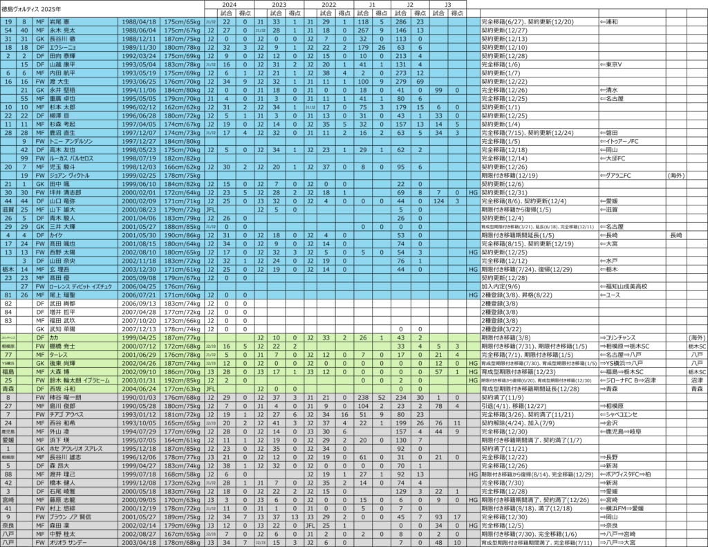 徳島ヴォルティス、契約更新状況(2025/01/07) 2025.01.08 1/7、愛媛に期限付き移籍していた浜下 瑛選手の契約満了が発表、そして、内田 航平選手の契約更新が発表となった。これで、33人。A契約もこれで27いっぱいかな?背番号も発表となった。岩尾選手は8番。永木選手は40番と。