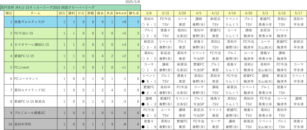 徳島ヴォルティスJY 9-1(3-0,6-1) 高知中学校