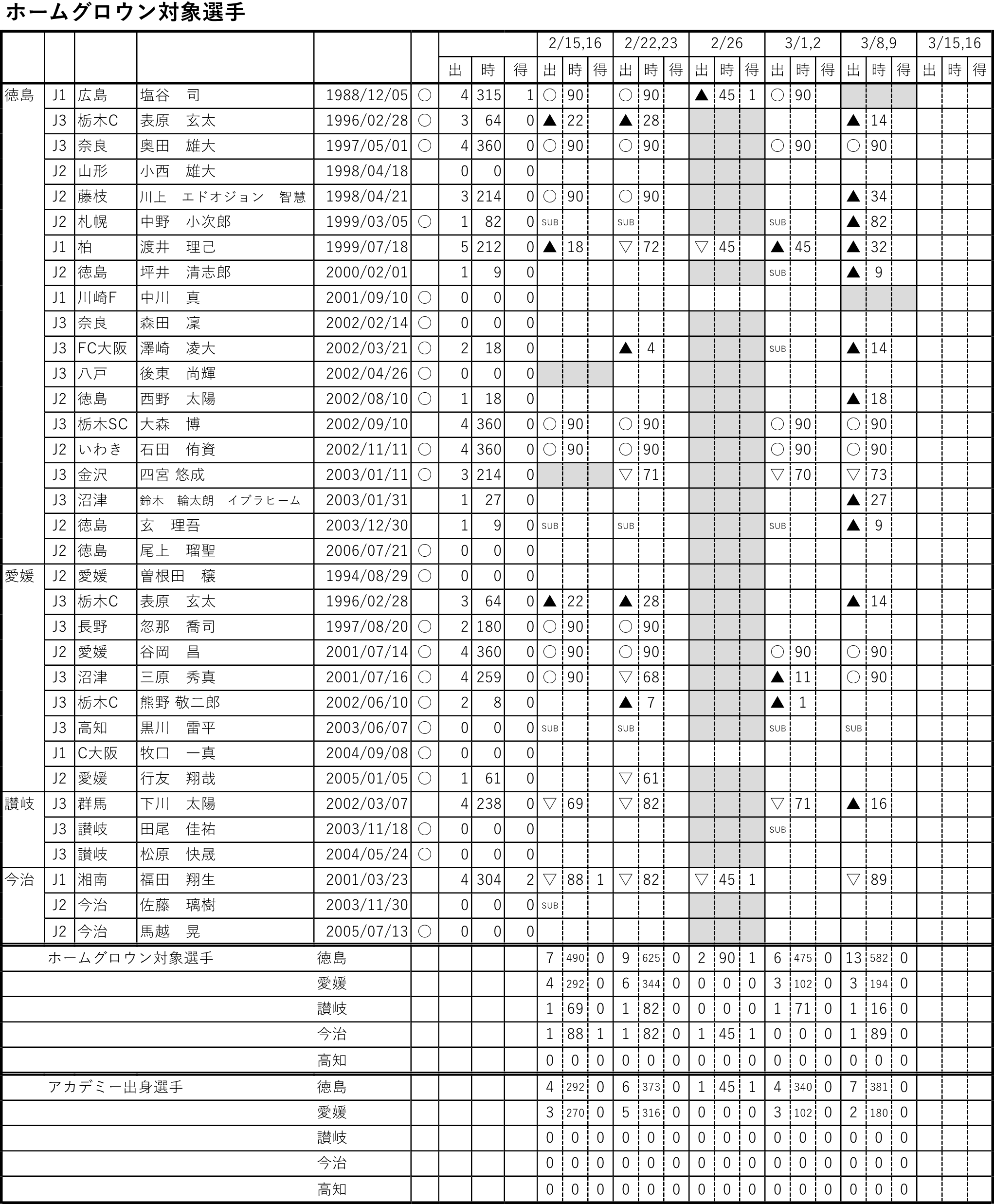 四国5クラブのホームグロウン対象選手の一覧と、今シーズン、ここまでの出場記録である。