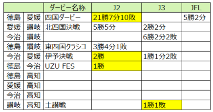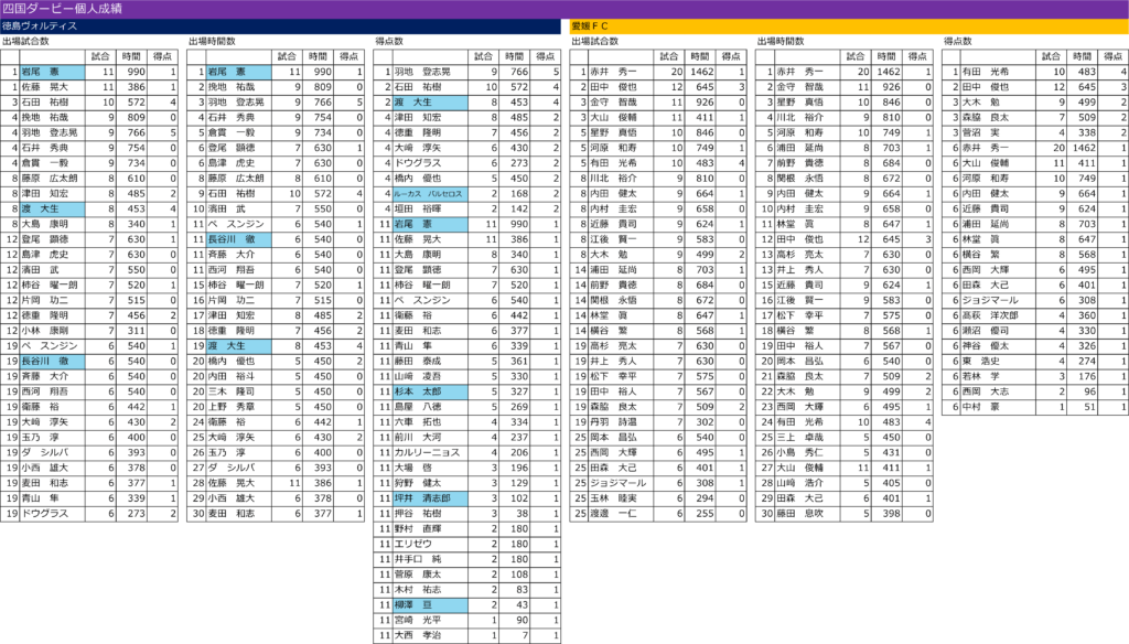 四国ダービーの個人成績、バルセロス選手はこれで、四国ダービー2得点