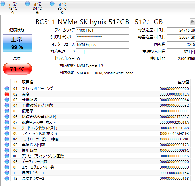 温度が高い….。とりあえず、PCは健康みたい。使用時間は意外に少なく 2300時間なのか…