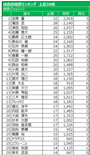 徳島ヴォルティスの月別の出場記録などを作ってみた。昨日時点でのデータである。