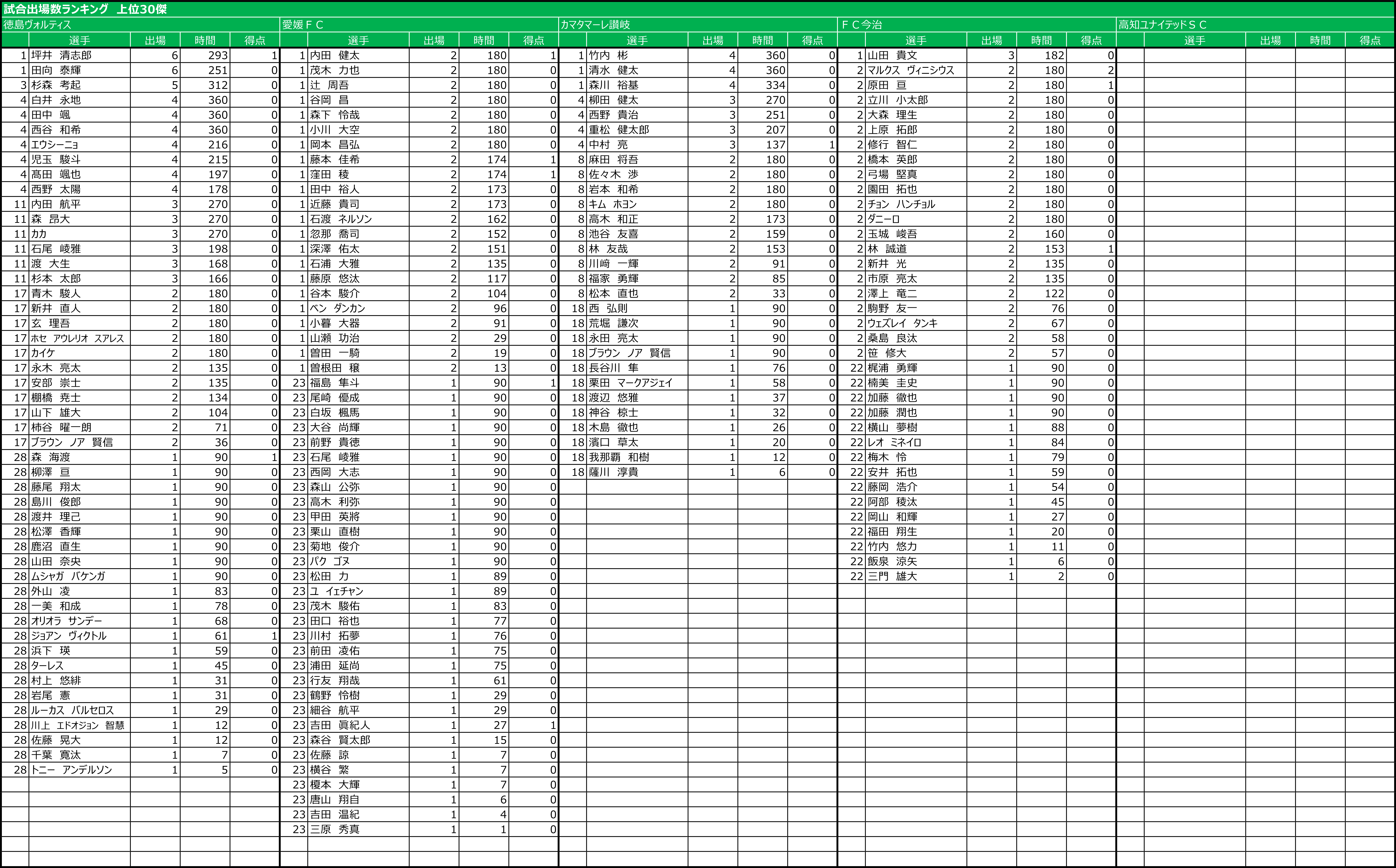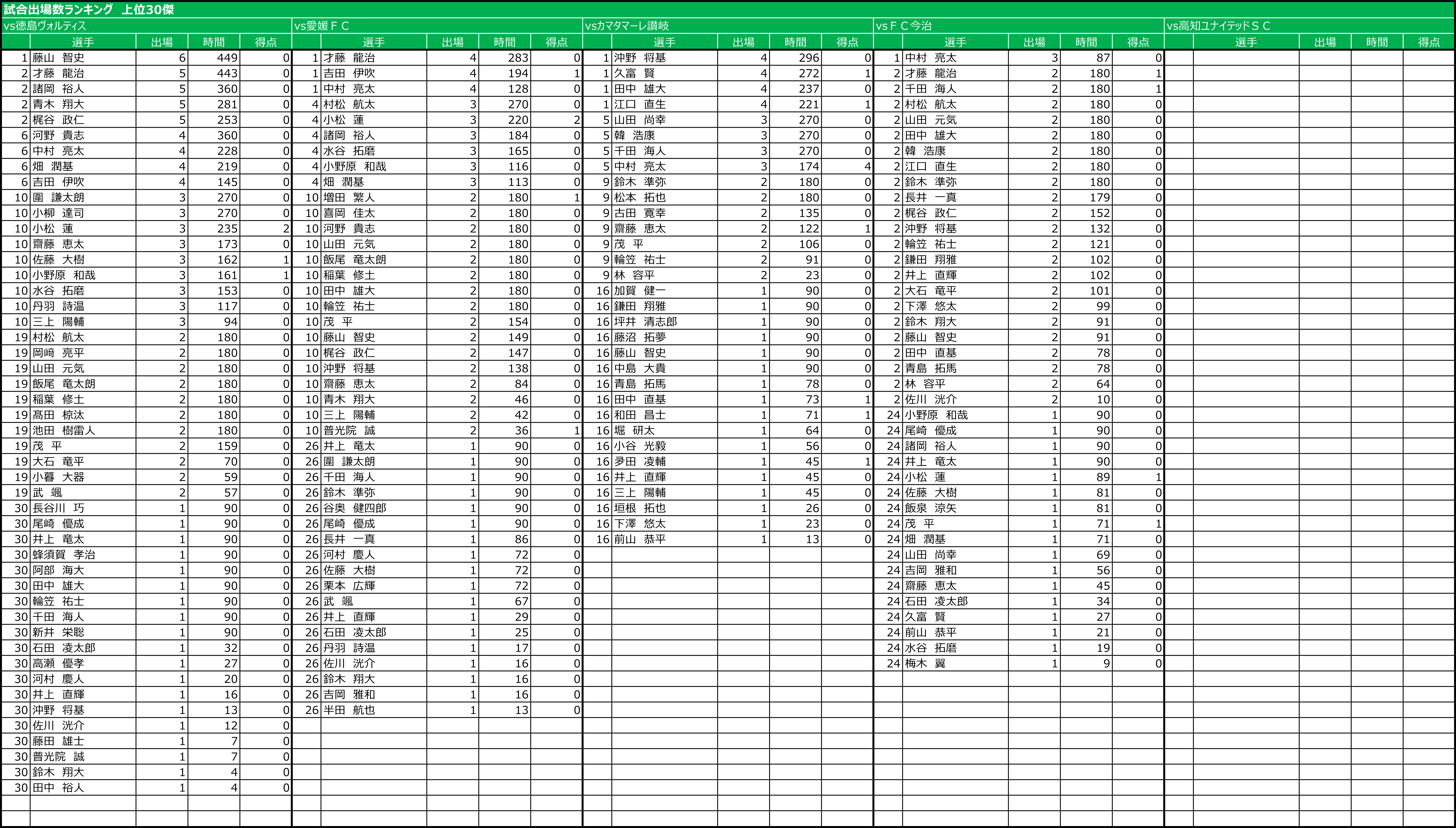 秋田戦データ 2025.08.30 出場記録、得点記録、などなど、画像は出場試合数ランキング、得点数ランキングのみを、、、PDFにはいろんなデータが入っています。秋田とはこれまで7試合対戦。0-0,0-0,0-0,1-1,1-2,0-2,2-0。お互いに1得点ずつがオウンゴール。なので、徳島では得点をあげた選手は3人。秋田も3人、そして、小松 蓮選手はもういない。 秋田側からのデータは、、、 PDFは、、、以下を参照。徳島vs秋田:~30位、~100位、背番号別秋田vs徳島:~30位、~100位、背番号別