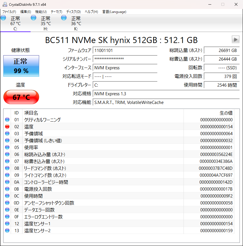 で、CrystalDiskInfo を実行してみた。