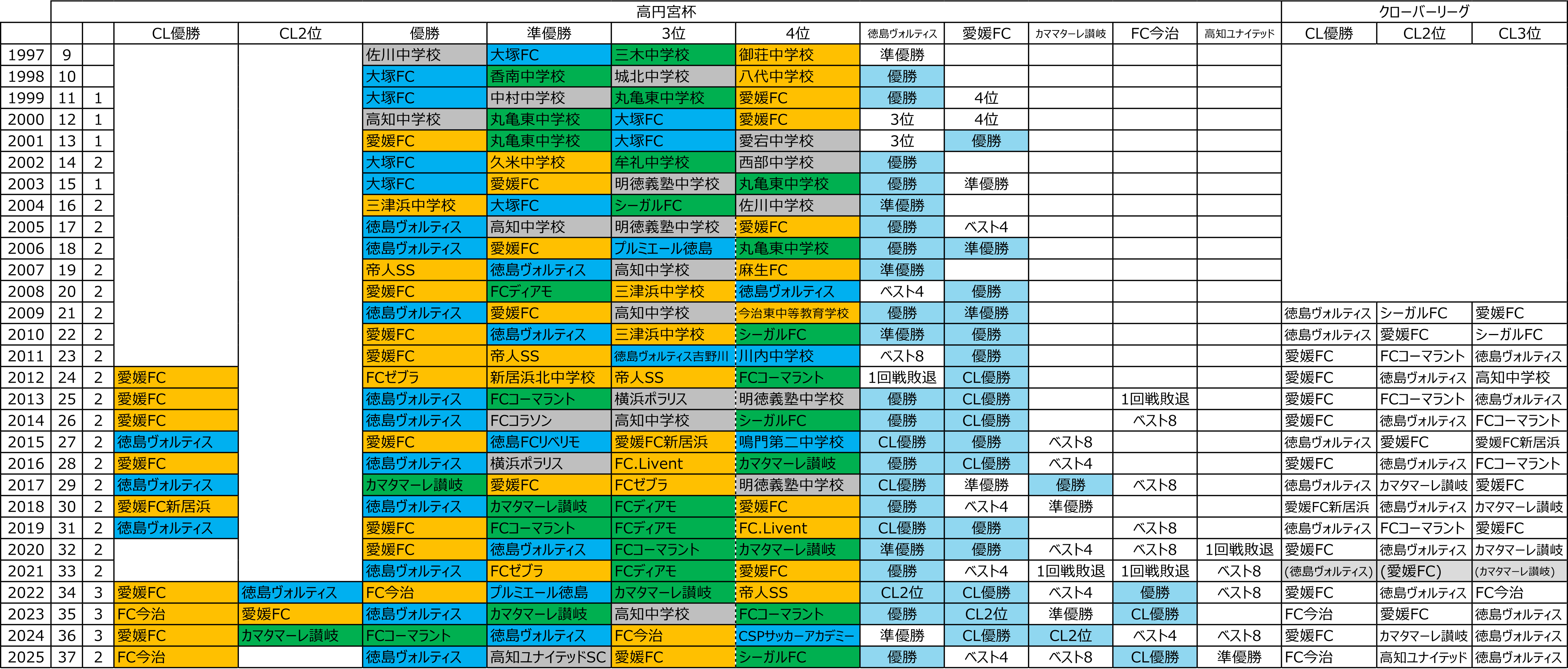 ところで、今年は非常に混戦ではありました。クラブユース選手権は四国は2013年以降2枠。高円宮杯は2004年以降2枠(2022~2024年は3枠、また2003年以前にも2002年とか2枠だったり)であるが、2013年以降コロナ禍の2020年を除いて、今年は初めて両方の大会の全国出場が別々のチームとなった。まぁ、それだけ混戦なのだろう。非常に差がなくなってきた。