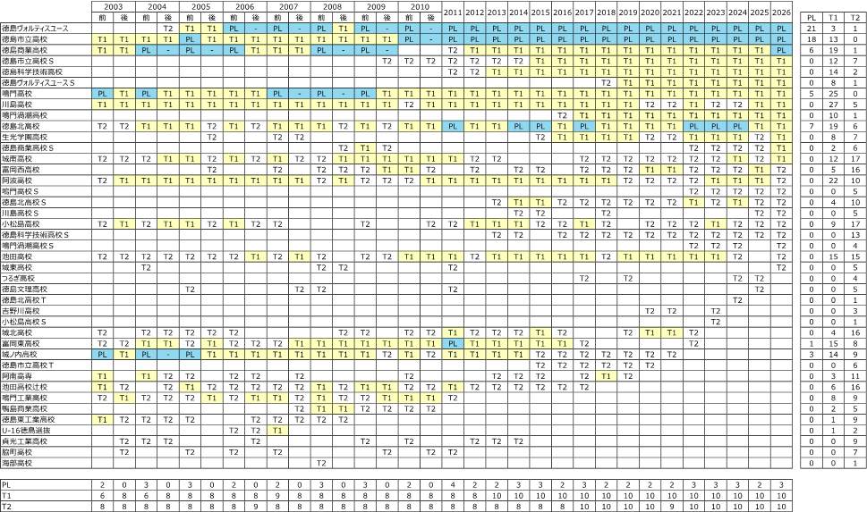 徳島ヴォルティスユースは2004年前期がT3、昇格して2004年後期がT2、そして2005年前期がT1であるが、このときは激戦で、8チーム中半数の4チームが降格するという中、ぎりぎり残留し、2005年後期にT1を制し、2006年からプリンスリーグ四国に参入。2026年の今年は21回目のプリンスリーグ四国となる。途中、2回降格したが、即復帰を果たして、21年連続となる。