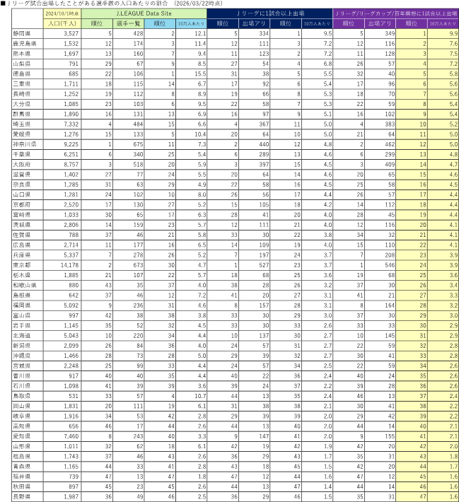10万人あたりのJリーグ/リーグカップ/百年構想リーグの試合出場選手が多い都道府県ランキング